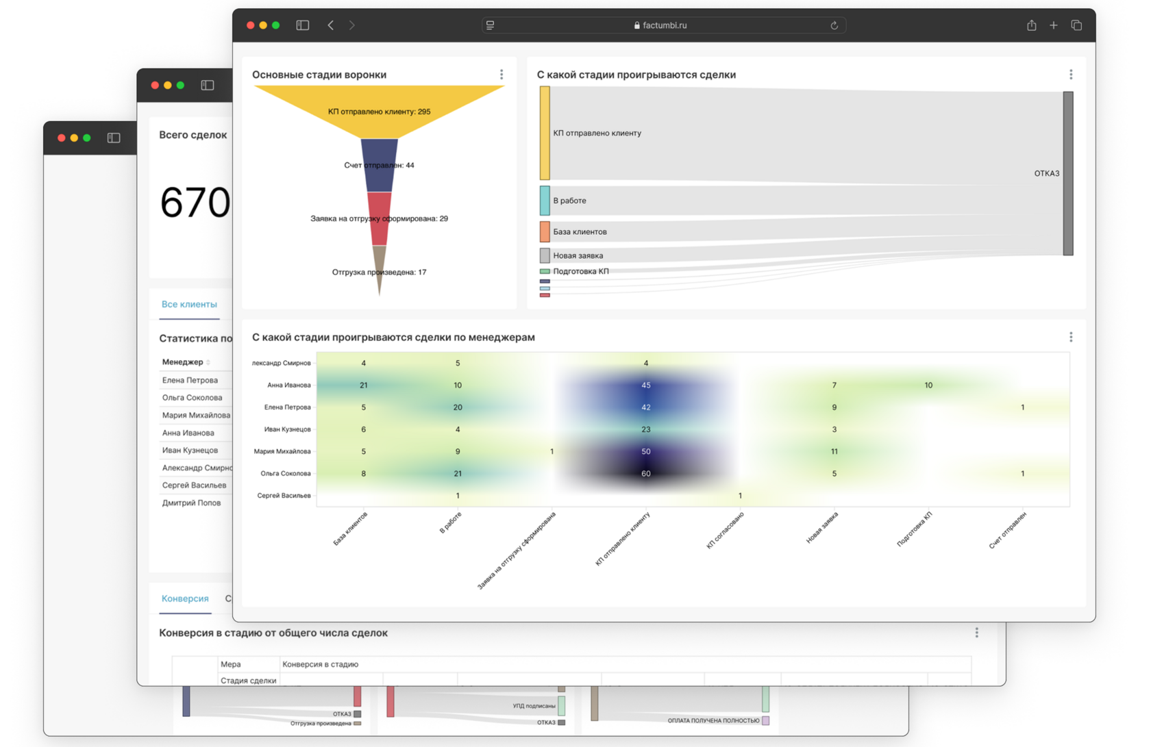 • Полностью оцифрована воронка продаж с подсветкой узких мест и причин отказов
