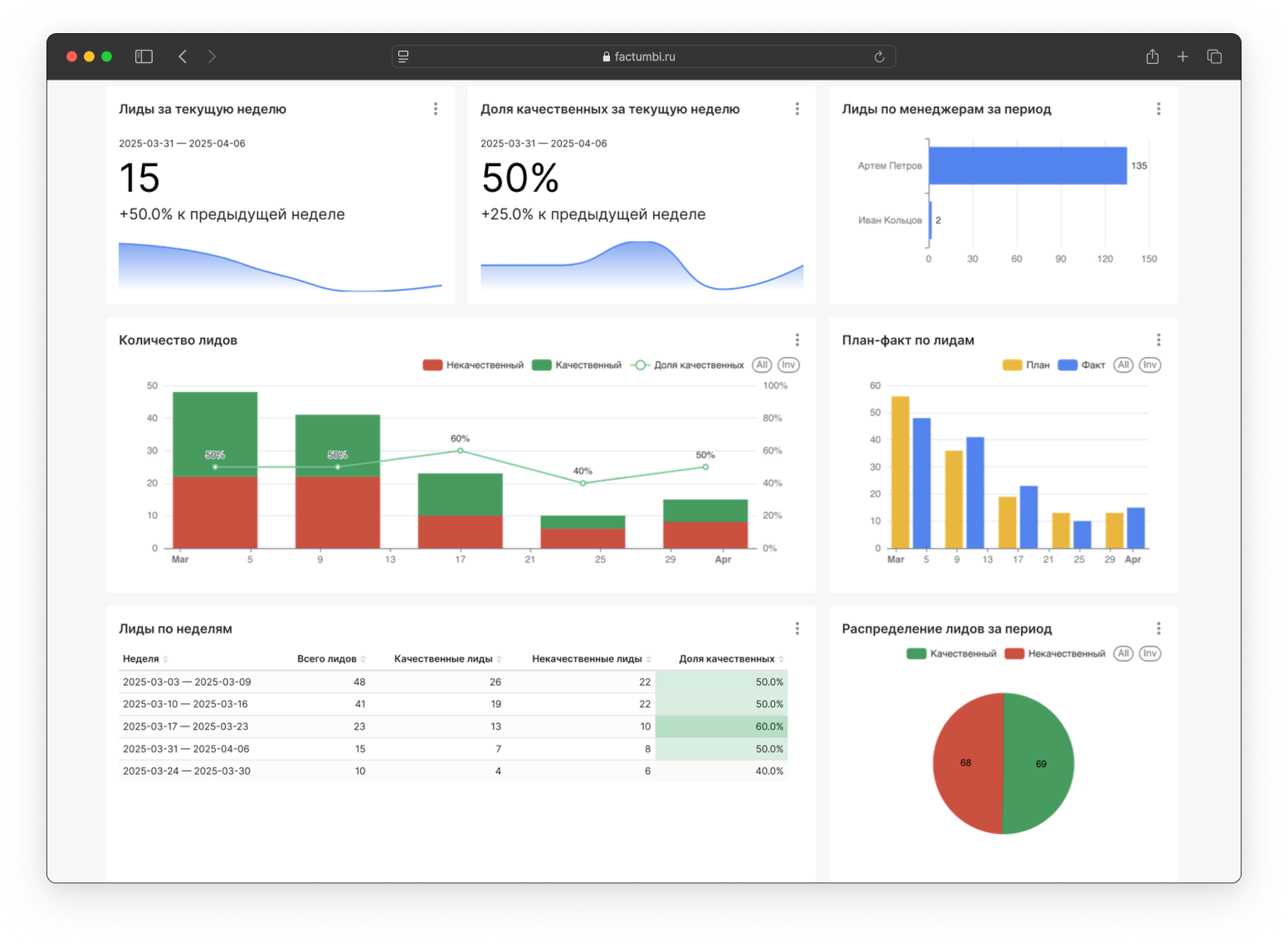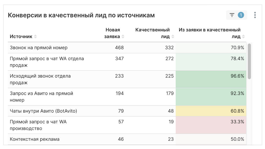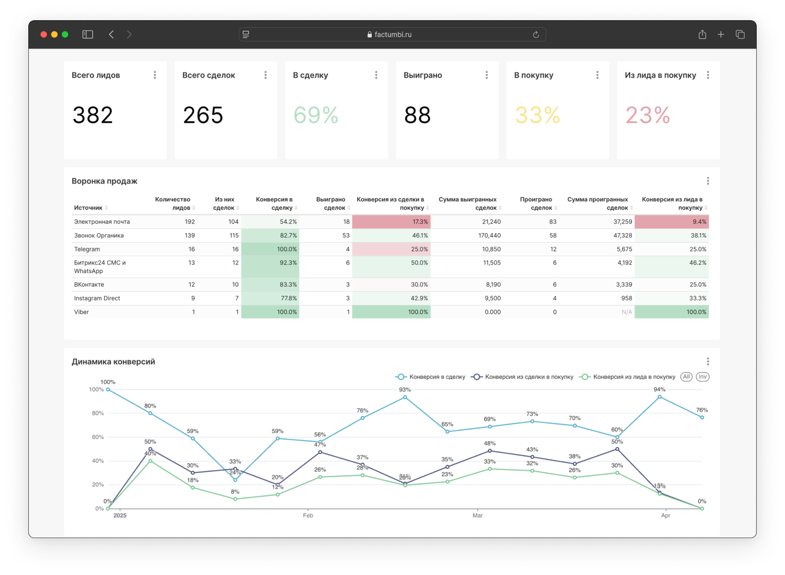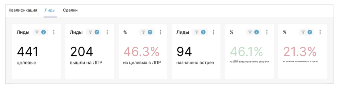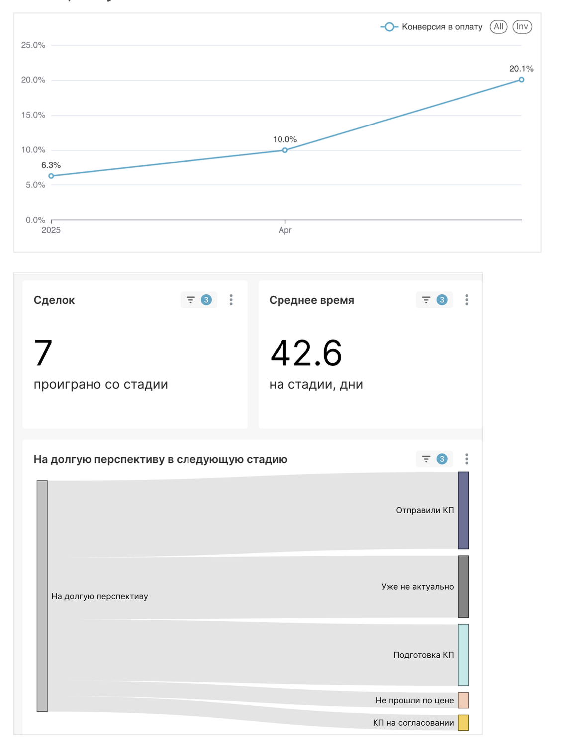 • Лиды привязаны к сделкам для оценки эффективности источников и построения сквозной аналитики