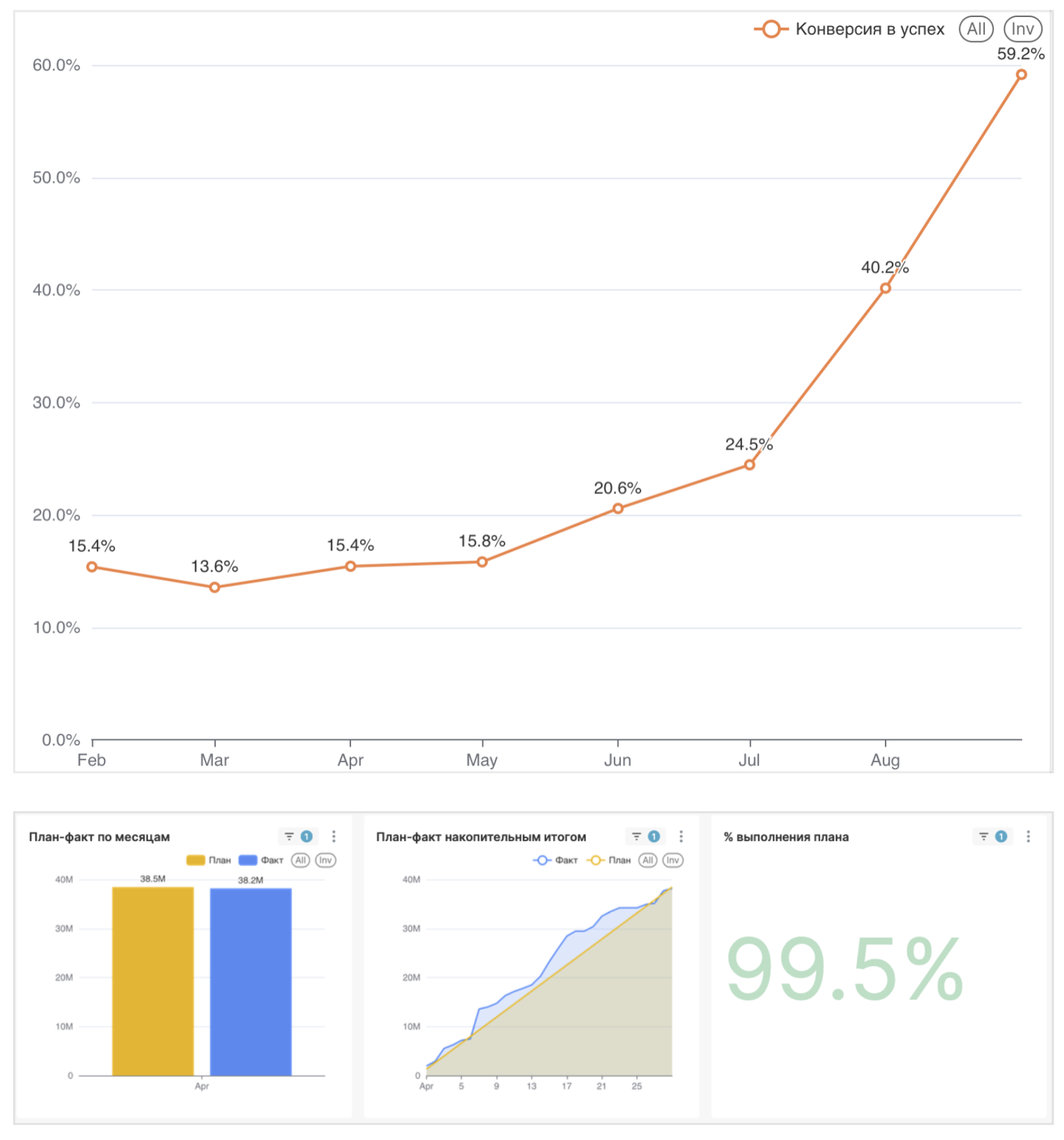 • Общая конверсия отдела продаж выросла со средних 6% до 9-10% после внедрения аналитики